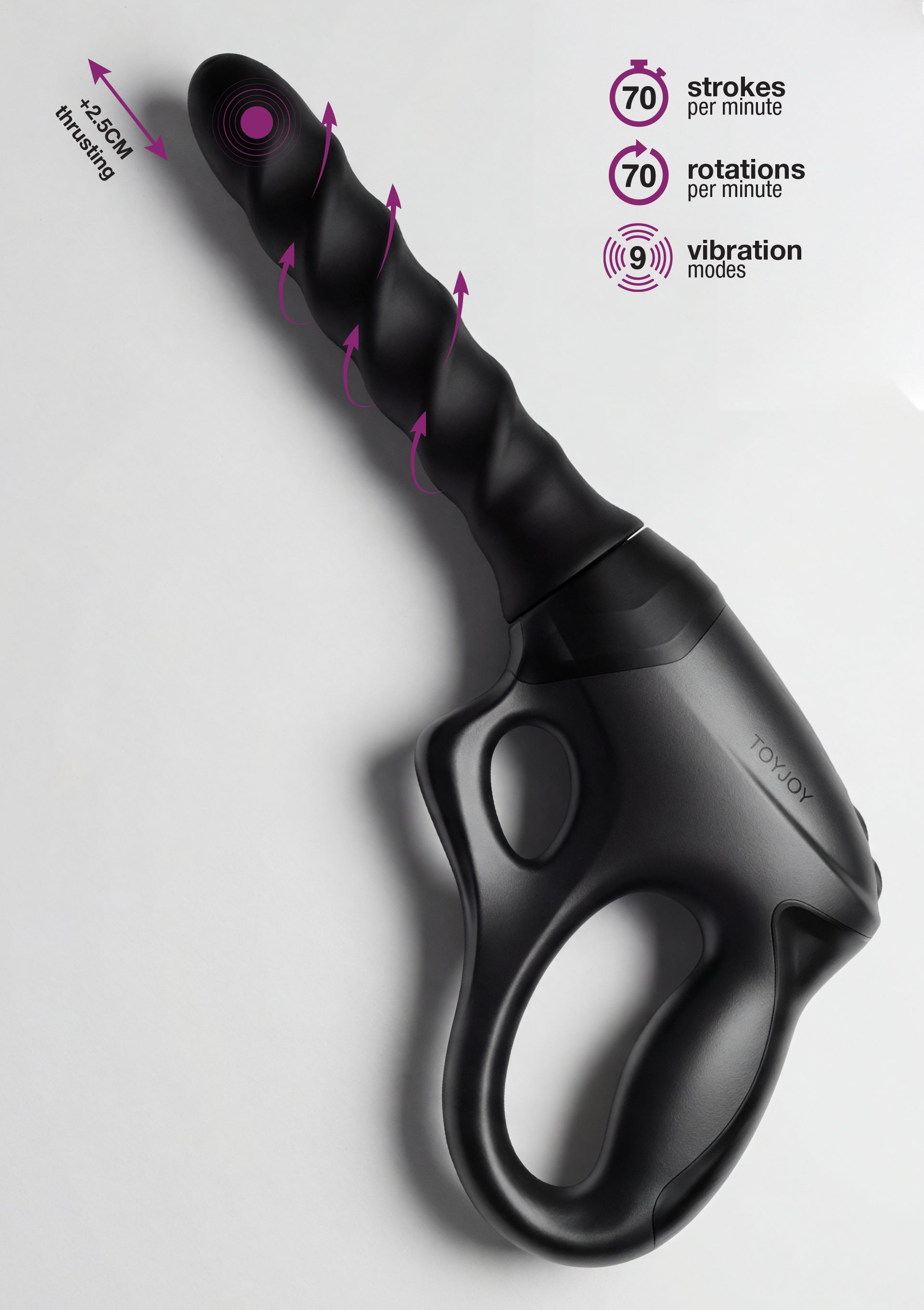 Its distinctive pistol-grip handle offers firm, effortless control, while the patented 360° rotating, thrusting, and vibrating shaft creates a swirling internal sensation that builds with every second. The powerful thrusting motion reaches up to 2.5 cm, delivering 70 strokes per minute, combined with 70 rotations per minute for a deeply immersive experience. Whether you lead with a steady pulse or a daring twist, the dangerously smooth rotation and thrusting of the PRO+ responds to your desires with commanding accuracy, while 9 vibration modes offer plenty of options to match your mood.