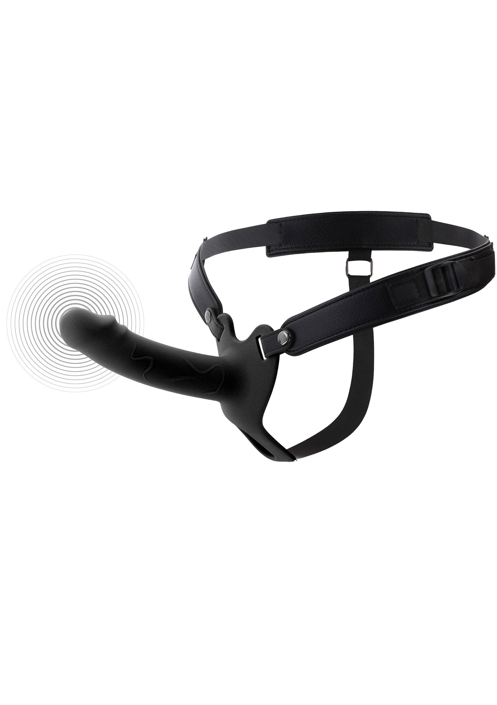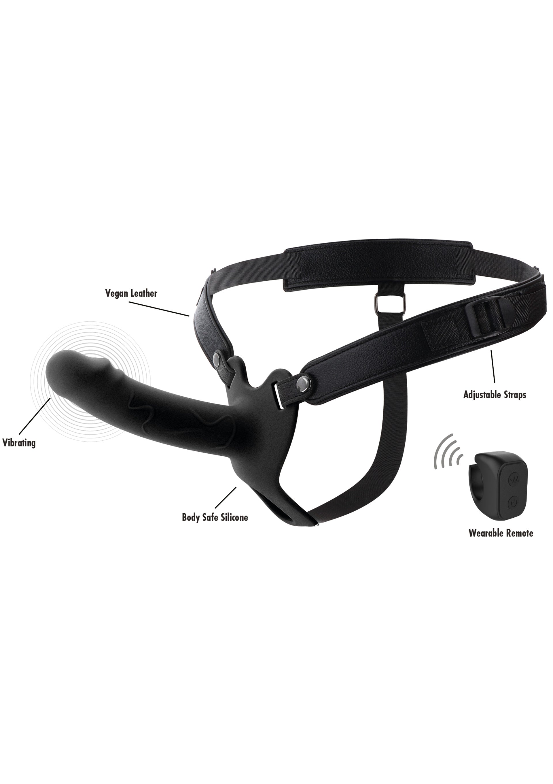 The adjustable harness is made of vegan leather and nylon for a secure, comfortable fit. Use a water-based lube for smooth play, and clean with warm water after use.