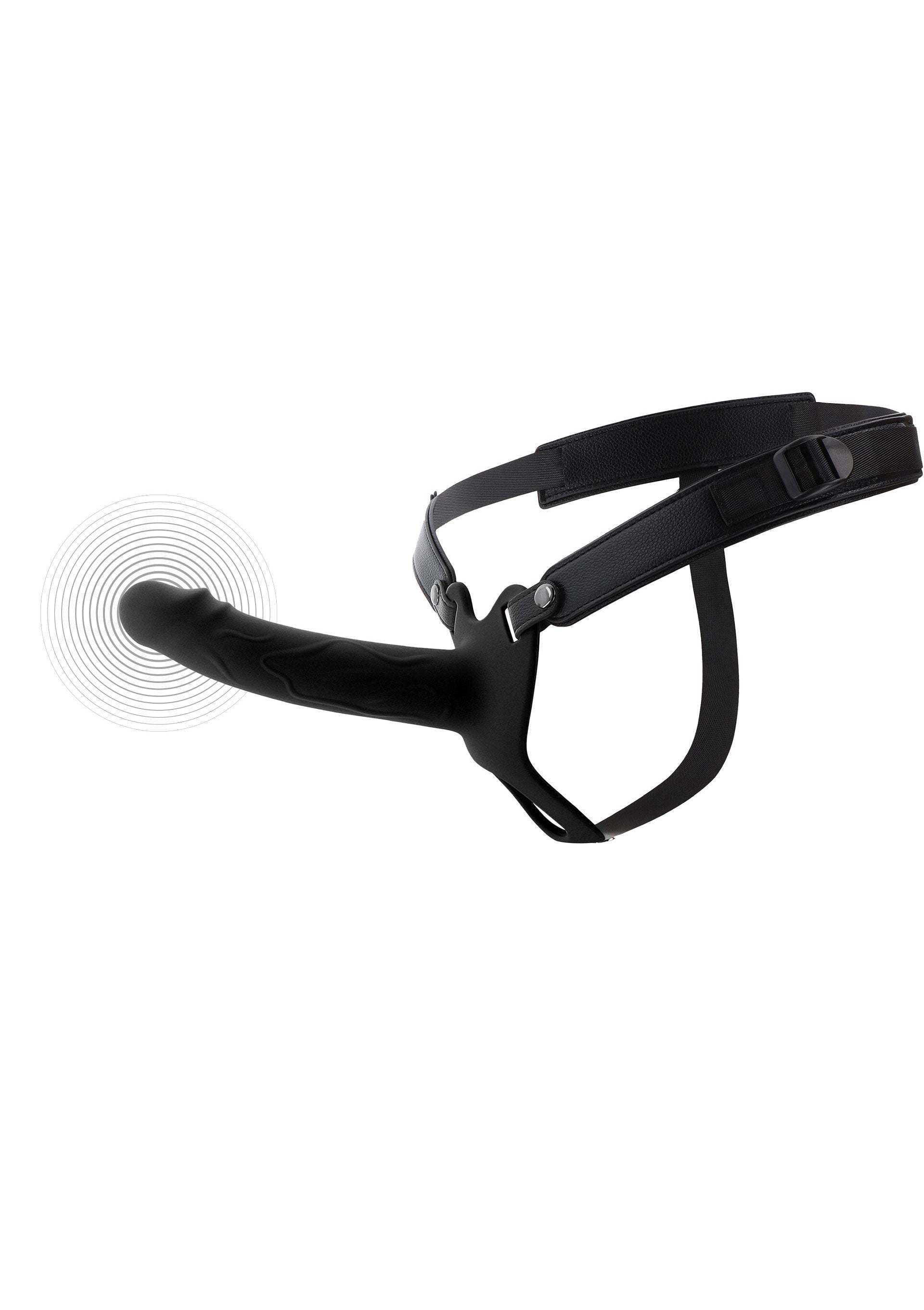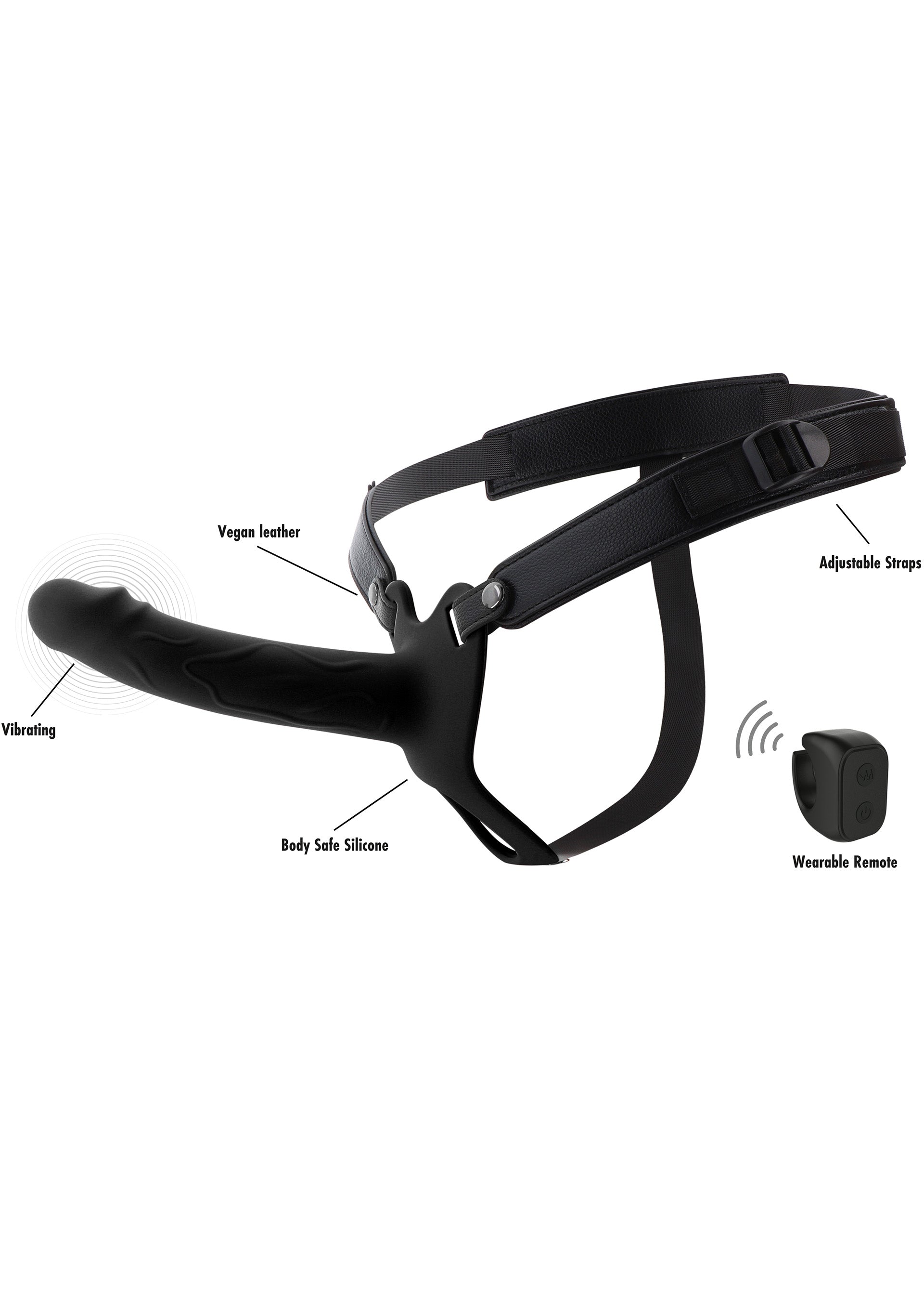 The adjustable harness is made of vegan leather and nylon for a secure, comfortable fit. Use a water-based lube for smooth play, and clean with warm water after use.